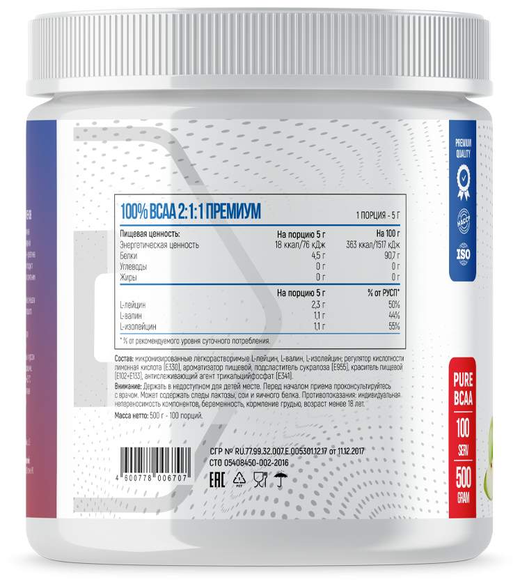 100% BCAA 2:1:1 Premium сочетает в себе сырье премиум качества Instant и технологию семиступенчатой обработки Instantized. Какая вам от этого польза? Эта добавка растворяется и усваивается организмом значительно быстрее в сравнении с аналогами. Более того, на каждую порцию приходится до 91% БЦАА.
