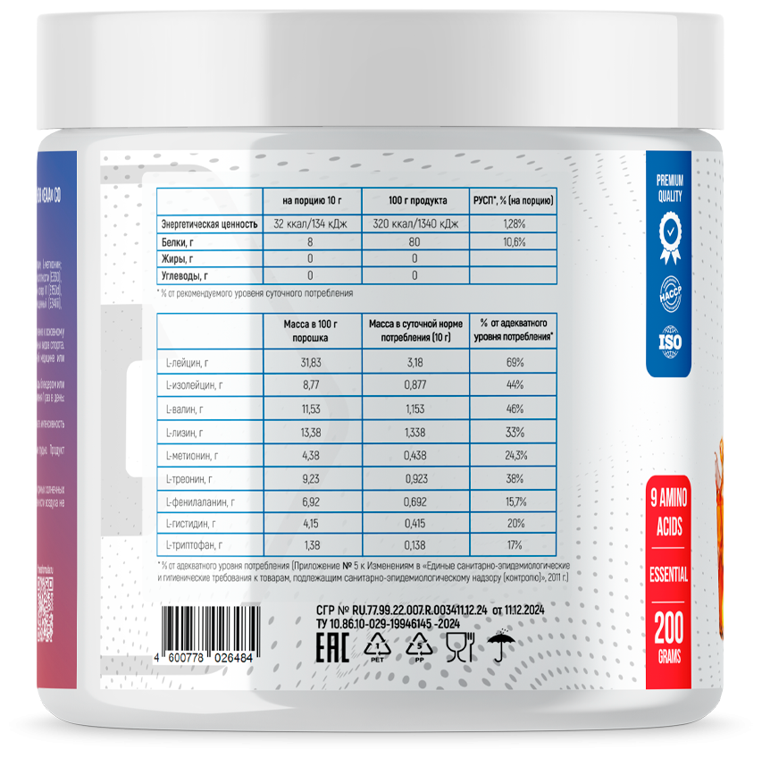 - Полный спектр EAA - 9 незаменимых аминокислот в оптимальном соотношении для быстрого усвоения.