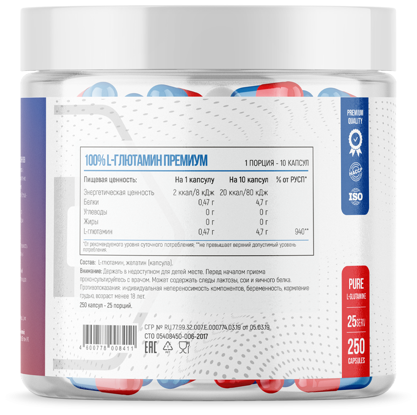 L-глютамин, желатин (капсула).