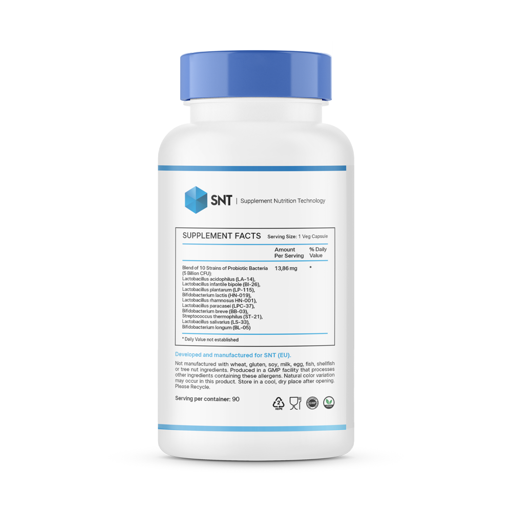 Пробиотическая смесь от SNT содержит 10 активных и клинически изученных штаммов пробиотиков. Исследования подтверждают, что пробиотические штаммы в составе пробиотика SNT чрезвычайно устойчивы к низким уровням pH и воздействию факторов желудочно-кишечного тракта (например, кислоты, желчи, пепсина и панкреатина), а также закрепляются на клеточных линиях кишечника.